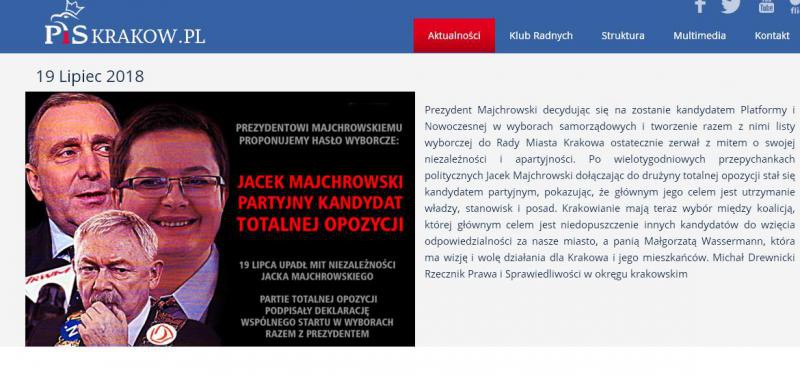 Działacze PiS przygotowali ulotkę, którą pochwalili się na Facebooku, na stronie internetowej Piskrakow.pl i konferencji prasowej. Na ulotce napisano: "19 lipca upadł mit niezależności Jacka Majchrowskiego. Partie Totalnej Opozycji podpisały deklarację wspólnego startu w wyborach razem z prezydentem" i zamieszczono zdjęcia Grzegorza Schetyny, Katarzyny Lubnauer oraz Jacka Majchrowskiego.