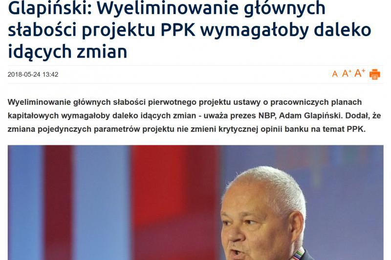 Chodzi o depeszę z 24 maja pt. "Wyeliminowanie głównych słabości projektu PPK wymagałoby daleko idących zmian – Glapiński". Prezes Narodowego Banku Polskiego Adam Glapiński wypowiada się w niej krytycznie o projekcie ustawy o pracowniczych planach kapitałowych przygotowanym przez Ministerstwo Finansów. Depesza była publikowana przez różne serwisy, m.in. Bankier.pl i Polskieradio.pl.