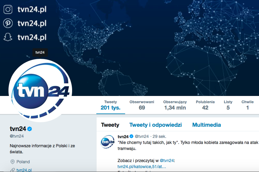 Profil TVN 24 miał w sierpniu 1,33 mln obserwujących (screen: twitter.com/tvn24)