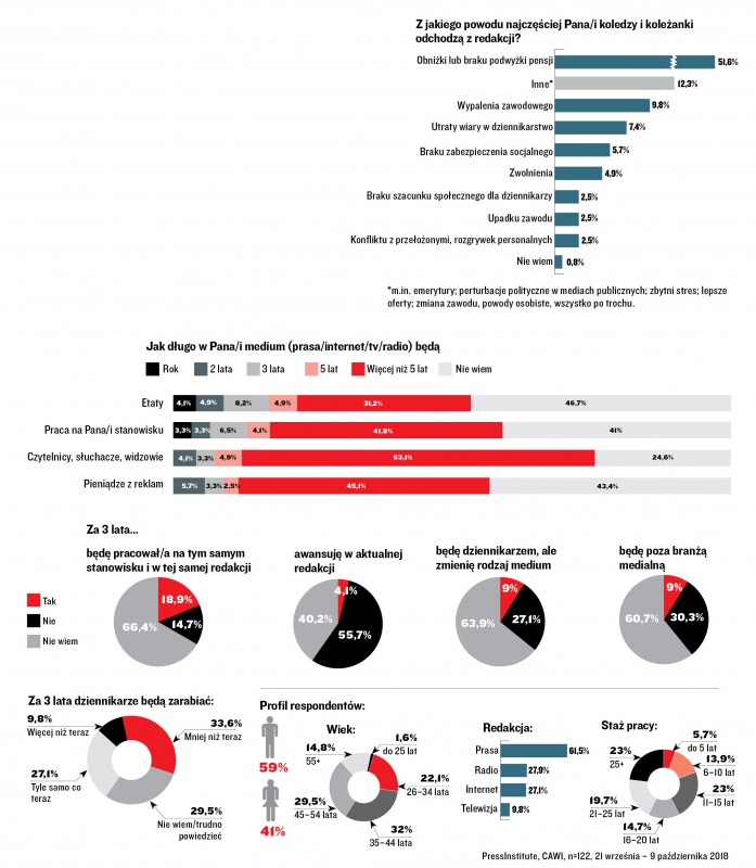 Co do przyszłości mediów, to chociaż sporo jest wśród badanych optymistów, którzy sądzą, że za pięć lat, a nawet później media będą nadal miały odbiorców (63 proc.) i reklamodawców (45 proc.) oraz że w mediach będą etaty (31 proc.) – to aż 61 proc. badanych dziennikarzy nie wie, czy za trzy lata wciąż będą związani z branżą medialną. Tylko 30 proc. uważa, że w niej pozostanie.
