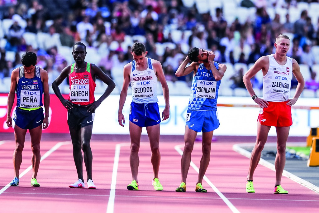 Londyn. Zawodnicy przygotowujący się do startu w półfinale biegu na 3000 m z przeszkodami podczas Mistrzostw Świata w Lekkiej Atletyce. 6 sierpnia 2017/Aleksandra Szmigiel, Agencja Fotograficzna Reporter