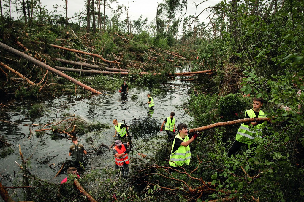 Skutki nawałnicy, która w nocy z 10 na 11 sierpnia 2017 roku przeszła od Dolnego Śląska przez Wielkopolskę i Kujawy po Pomorze Gdańskie oraz Warmię. Konigort: ochotnicy i mieszkańcy okolicznych miejscowości usuwają powalone drzewa w korycie rzeki Brdy. Zdjęcie pochodzi z reportażu realizowanego w dniach 16–22 sierpnia 2017/Mirosław Pieślak, „Fakt”