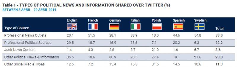 Z raportu wynika, że średnio prawie 4 proc. wpisów na Twitterze zawierało odnośniki do stron szerzących dezinformację. W przypadku Polski ten odsetek wyniósł 21 proc. i był największy spośród pozostałych badanych krajów. Na drugim miejscu znalazły się Włochy – 8,7 proc., na trzecim Szwecja – 6,7 proc. Średnio 33,9 proc. wpisów na Twitterze miało linki prowadzące do profesjonalnych źródeł informacji; w Polsce odsetek był najmniejszy i wyniósł zaledwie 13 proc.
