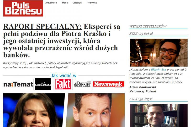 Platforma Bitcoin Era, prowadząca sprzedaż kryptowalut, w kampanii internetowej na Facebooku tym razem podszywa się pod internetowy serwis „Pulsu Biznesu”. Do promocji wykorzystuje też fałszywą wypowiedź Piotra Kraśki.
