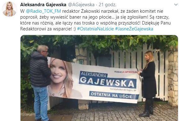 W @Radio_TOK_FM redaktor Żakowski narzekał, że żaden komitet nie poprosił, żeby wywiesić baner na jego płocie... ja się zgłosiłam! Są rzeczy, które nas różnią, ale łączy nas troska o wspólną przyszłość! Dziękuję Panu Redaktorowi za wsparcie! :) #OstatniaNaLiście #JasneŻeGajewska pic.twitter.com/SRWVr4G9YU