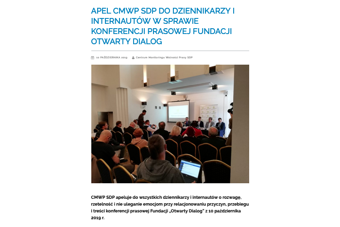Centrum Monitoringu Wolności Prasy SDP zaapelowało o "rozwagę i przestrzeganie zasad etyki dziennikarskiej przy relacjonowaniu konferencji prasowej Fundacji Otwarty Dialog". Tuż po tym, jak fundacja poinformowała, że jest celem ataków ze strony rządu i złożyła 20 pozwów przeciw politykom PiS oraz dziennikarzom, którzy byli częścią "zmasowanej kampanii propagandowej". - CMWP mogłoby sobie darować ten apel, biorąc pod uwagę swoją hipotekę polityczną i proweniencję - mówi Jan Ordyński.