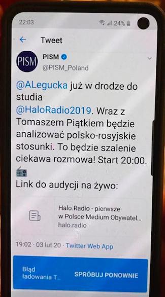 Dyrektor Polskiego Instytutu Spraw Międzynarodowych tuż przed audycją Tomasza Piątka w Halo.radiu zabronił wystąpienia w niej analityczce Agnieszce Leguckiej. Wcześniej sam PISM na Twitterze zapowiadał program z udziałem swojej pracowniczki.