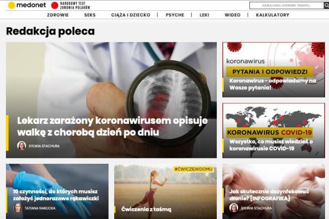 Jak wynika z danych Gemius/PBI, serwis Medonet.pl odwiedziło w lutym 8,62 mln użytkowników (wzrost o 78,83 proc. w porównaniu z lutym 2019 roku). Dalej znalazły się: Abczdrowie.pl - 5,98 mln (spadek o 2,12 proc.), Poradnikzdrowie.pl - 5,78 mln (spadek o 34,83 proc.), Mp.pl - 4,89 mln (wzrost o 20,14 proc.), Doz.pl - 4 mln (spadek o 12,08 proc.), Zdrowie.wprost.pl - 3,13 mln (w styczniu 2019 roku poza top 10 zestawienia), Znanylekarz.pl - 2,94 mln (spadek o 20,1 proc.), Zdrowie.radiozet.pl - 2,23 mln (wzrost o 277,96 proc.), Wiadomosci.onet.pl/medycyna-i-zdrowie - 2,03 mln (spadek o 23,1 proc.), Wylecz.to - 1,93 mln (spadek o 44,05 proc.).