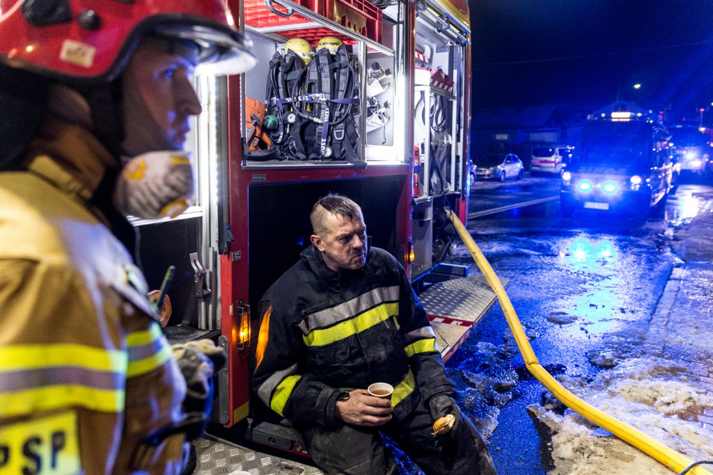 Strażak podczas chwili przerwy w akcji ratunkowej po tragicznym wybuchu gazu w Szczyrku.