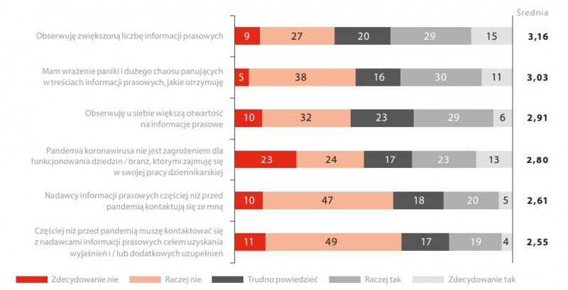 74 proc. dziennikarzy zgadza się ze stwierdzeniem, że branża medialna dobrze dostosowała się do sytuacji pandemii – przeciwnego zdania było 13 proc. badanych. Z kolei prawie połowa respondentów (47 proc.) uważa, że pandemia koronawirusa jest zagrożeniem dla funkcjonowania dziedzin/branż, którymi zajmują się w swojej pracy dziennikarskiej. 35 proc. z nich przyznaje, że sytuacja zmusza ich do opisywania dziedzin, w których się wcześniej nie specjalizowali.
