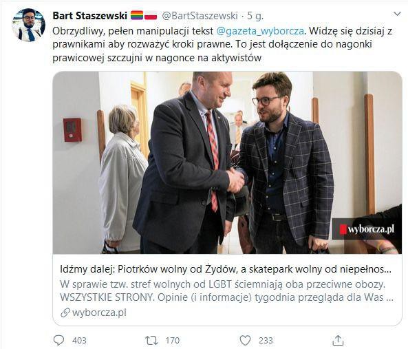 Na jego tekst zareagował na Twitterze Bart Staszewski. "Obrzydliwy, pełen manipulacji tekst @gazeta_wyborcza. Widzę się dzisiaj z prawnikami, aby rozważyć kroki prawne. To jest dołączenie do nagonki prawicowej szczujni w nagonce na aktywistów" - napisał.