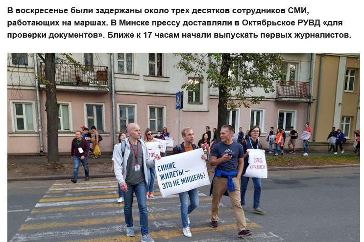 Natomiast, jak donosi Tut.by, już w trakcie marszów "w celu sprawdzenia dokumentów" zostało zatrzymanych ok. 30 przedstawicieli mediów. W tym gronie byli m.in. Jelena Tołkaczewa (Tut.by i BelaPAN), Tatiana Korowienkowa i Siergiej Sacziuk (BelaPAN), Dmitrij Dmitriew („Nowy Czas”), Jurij Szamszur (TASS). Wśród zatrzymanych znaleźli się też pracownicy agencji BelTA: fotoreporter Andriej Pokumeiko i Oksana Manczuk.