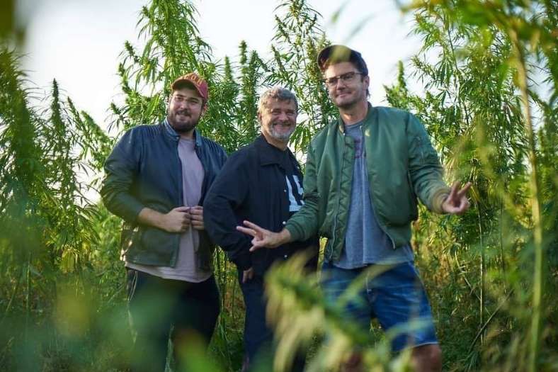 Tomasz Czechowski, Janusz Palikot i Kuba Wojewódzki pozują na tle krzewów konopi, bo ich piwo ma zawierać olejek z tej rośliny (fot. materiały prasowe)