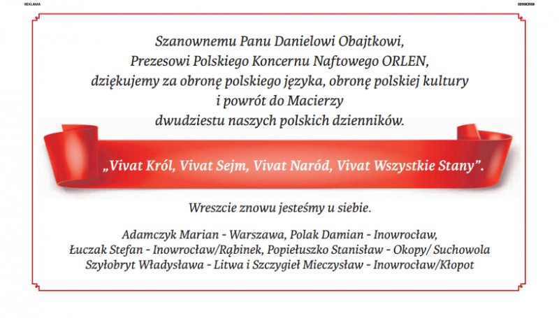 "Szanownemu Panu Danielowi Obajtkowi, Prezesowi Polskiego Koncernu Naftowego ORLEN, dziękujemy za obronę polskiego języka, obronę polskiej kultury i powrót do Macierzy dwudziestu naszych polskich dzienników" - czytamy w reklamie, w której pojawiło się zdanie z "Pana Tadeusza" Adama Mickiewicza: "Vivat Król, Vivat Sejm, Vivat Naród, Vivat Wszystkie Stany".