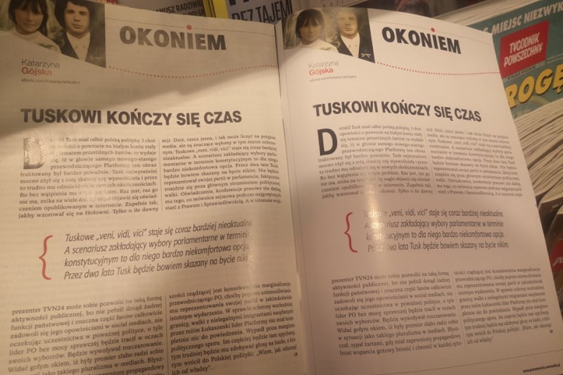 Felieton pod tytułem "Tuskowi kończy się czas" miał pojawić się jedynie na s. 104 tygodnika, na sąsiedniej miał być tekst Michała Rachonia, prywatnie męża Katarzyny Gójskiej. W związku z błędem redakcji tak się jednak nie stało. Przedstawiciele redakcji nie odpowiedzieli na pytania "Press", z czego wynika pomyłka ani czy tekst Rachonia zostanie opublikowany w innej formie.