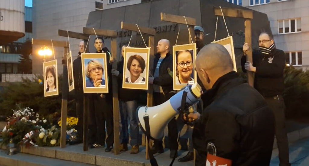 Środowisko narodowców zorganizowało pikietę z szubienicami jesienią 2017 roku. (fot. YouTube/Katowice24.info)