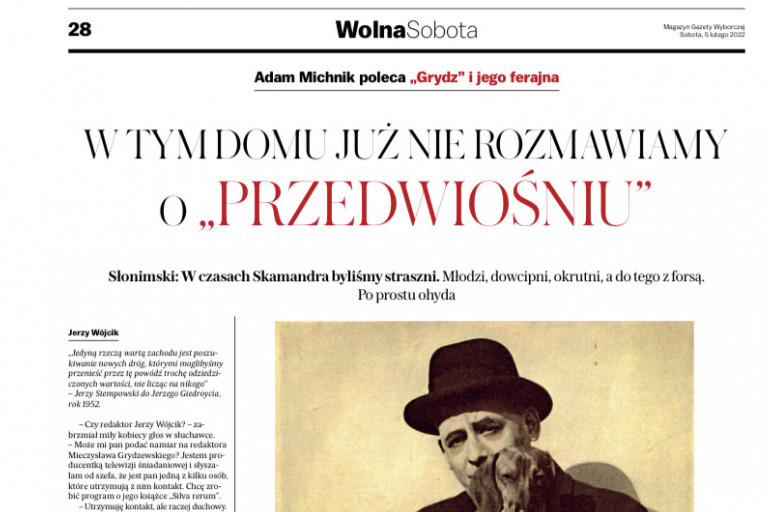 Artykuł autorstwa Jerzego Wójcika "W tym domu już nie rozmawiamy o »Przedwiośniu«. Grydzewski i jego ferajna" opublikowano w magazynie "Wolna Sobota". Artykuł był opatrzony dopiskiem redaktora naczelnego "Gazety Wyborczej" Adama Michnika: "Jerzy Wójcik, jeden z bezspornych twórców sukcesów »Gazety Wyborczej«, był mi dobrze znany jako menedżer i wizjoner rozwoju pisma. Niestety, padł ofiarą ludzi, którzy nie mają żadnego wkładu w powstanie »Gazety Wyborczej«, a którzy dziś jej nie rozumieją i ją lekceważą. (...) Ten świat Grydzewskiego, Tuwima, Słonimskiego, Boya i Lechonia, a także Antoniego Sobańskiego i Ireny Krzywickiej to tradycja, z której chcemy czerpać, tradycja, której chcemy pozostać wierni. Tych tradycji, tych wartości będziemy bronić uparcie, mam nadzieję, że wspólnie z Jurkiem Wójcikiem".