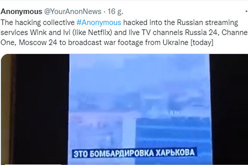 Grupie hakerskiej Anonymous udało się włamać do wszystkich istotnych rosyjskich stacji telewizyjnych i zmienić treści nadawane przez państwowe kanały. Pokazano m.in. zdjęcia z bombardowania Charkowa.