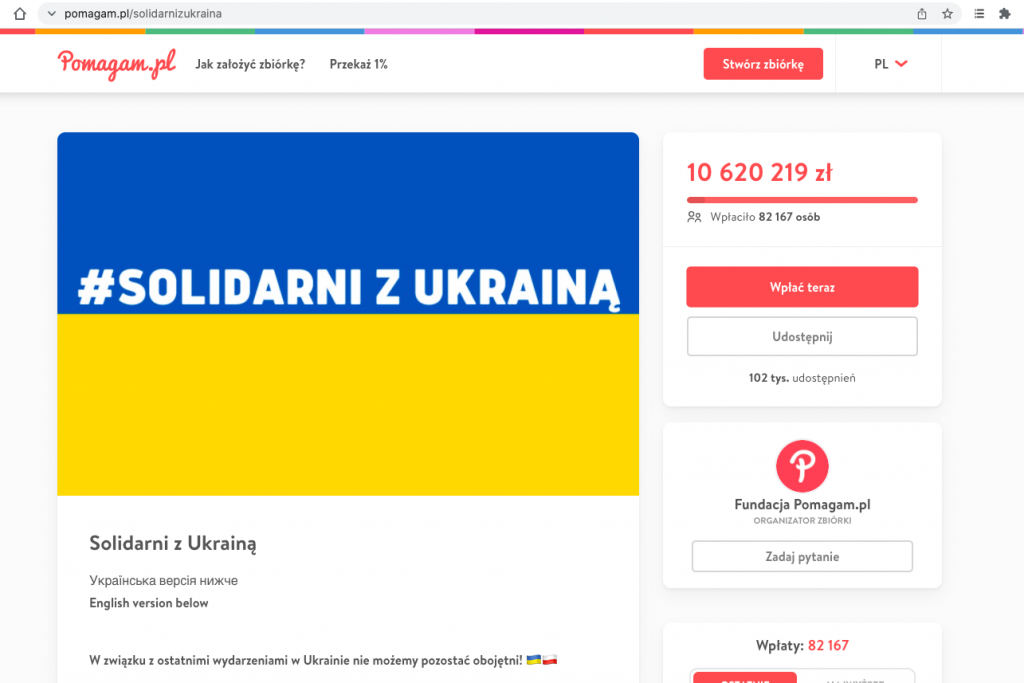 Prawidłowa zbiórka Fundacji Pomagam.pl dla Ukrainy jest pod adresem Pomagam.pl/solidarnizukraina