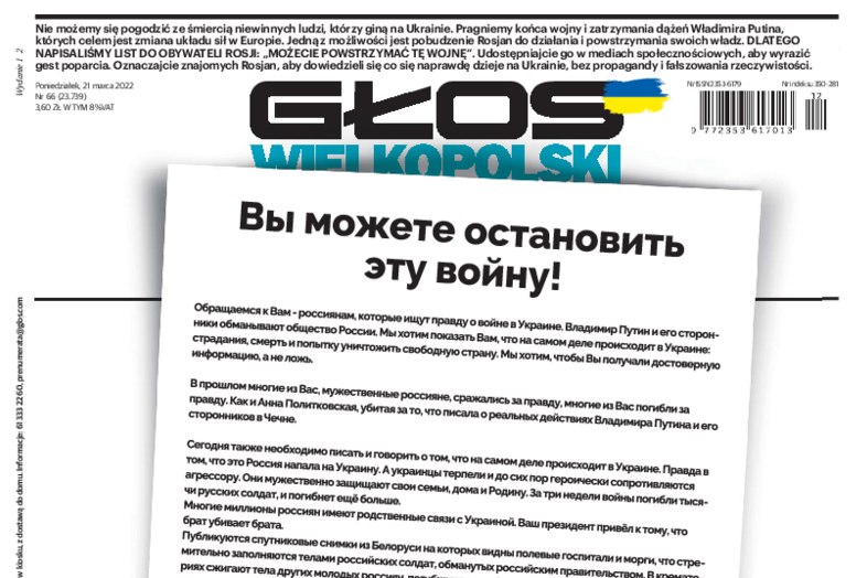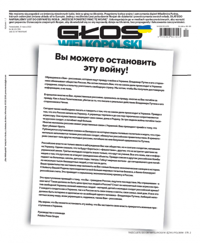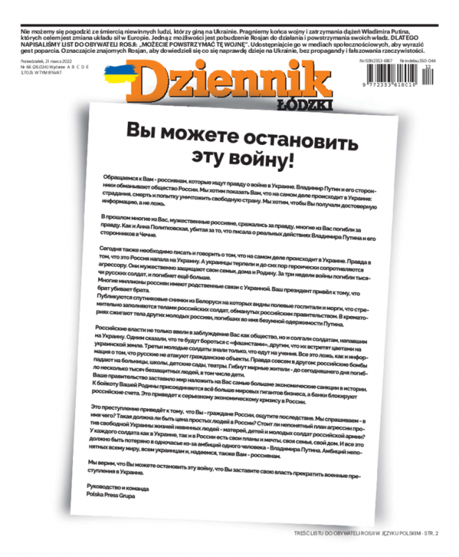 Na pierwszych stronach większości dzienników Polska Press - m.in. „Dziennika Bałtyckiego”, „Gazety Wrocławskiej”, „Dziennika Zachodniego”, „Gazety Pomorskiej” i "Głosu Wielkopolskiego" - opublikowano w poniedziałek po rosyjsku „List do Rosjan” zatytułowany „Wy możecie powstrzymać tę wojnę”. Autorami są „zarząd wraz z zespołem Polska Press”.