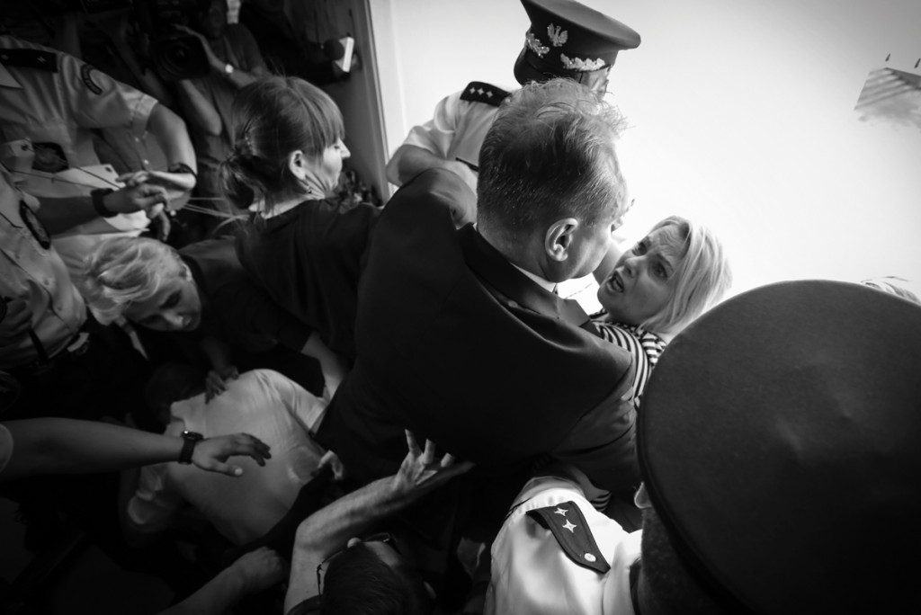 Warszawa, sejm. 37. dzień protestu rodziców i opiekunów osób niepełnosprawnych. Protestujący próbują rozwiesić transparent w języku angielskim na zewnętrznej ścianie budynku. Zwycięzca Grand Press Photo 2019