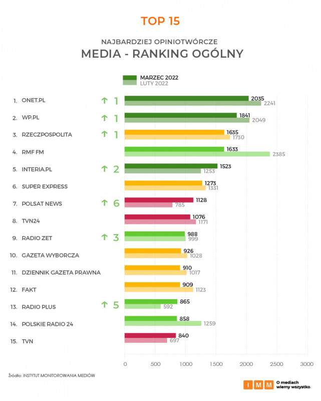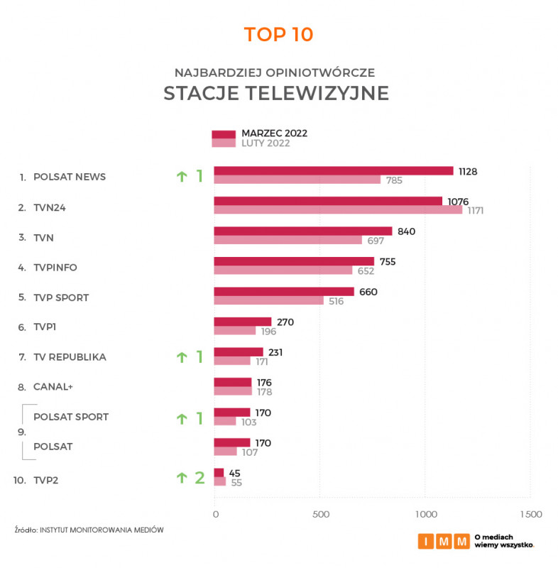 Na pierwsze miejsce w kategorii najbardziej opiniotwórczych stacji telewizyjnych powraca Polsat News z wynikiem 1128 powołań. Na antenie wyemitowano między innymi wywiad z premierem Mateuszem Morawieckim, który mówił o rozmowach z liderami państw zachodnich na temat nakładania dotkliwych sankcji na rosyjskie firmy. Drugie miejsce w marcowym zestawieniu zajmuje TVN 24 cytowany przez pozostałych dziennikarzy 1076 razy, natomiast podium - podobnie jak w zeszłym miesiącu - zamyka TVN z liczbą 840 wzmianek w innych tytułach.