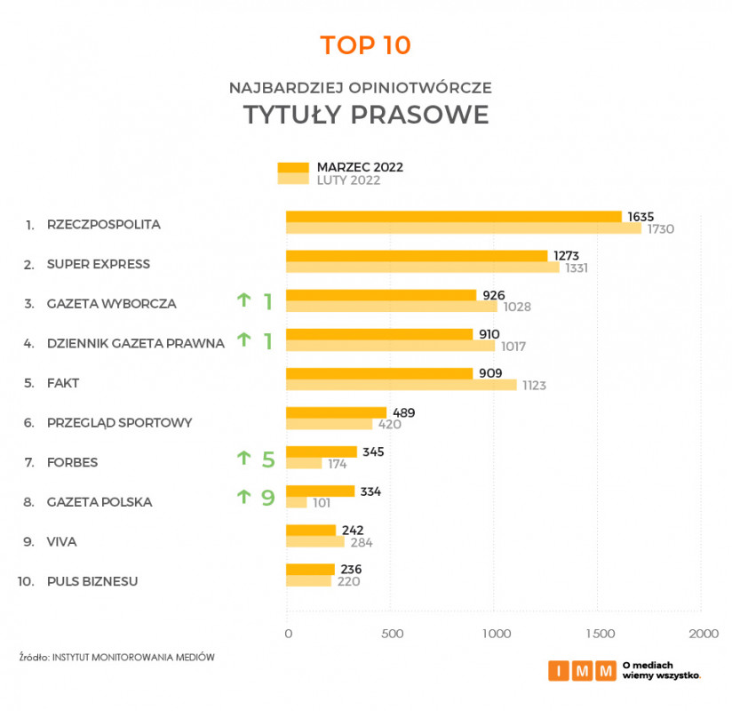 "Forbes" z wynikiem 345 cytowań utrzymuje pierwsze miejsce wśród najbardziej opiniotwórczych miesięczników i dwumiesięczników. Na drugie miejsce w marcu awansował miesięcznik "Twój Styl" z liczbą 78 powołań. Trzeci w zastawieniu jest "Press", na który powoływano się 65 razy.