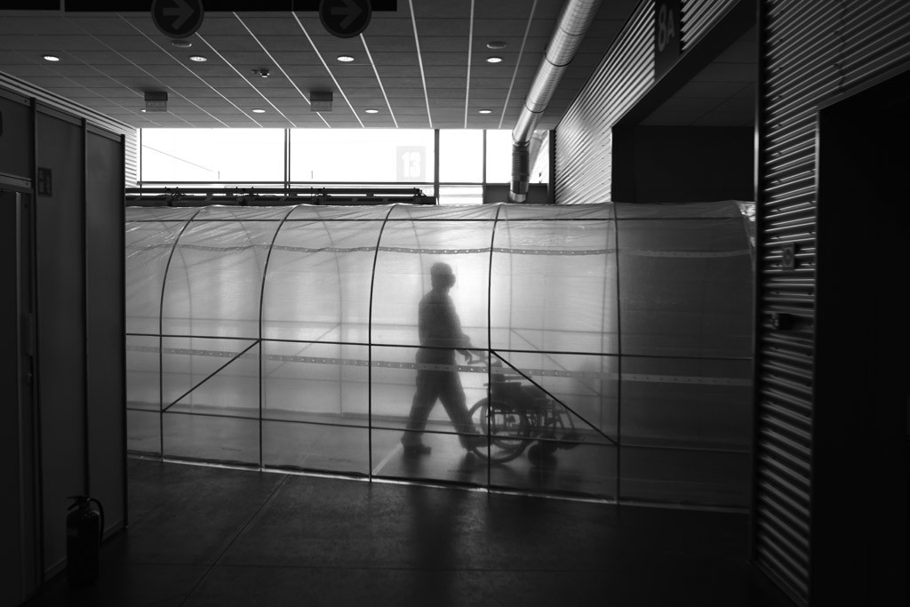 Hermetyczny tunel łączący oddziały strefy skażonej szpitala tymczasowego na terenie poznańskich targów przebiega eksterytorialnie przez korytarz strefy czystej. Na zdjęciu odziany w kombinezon ochronny medyk przemieszcza się z wózkiem inwalidzkim między oddziałami.