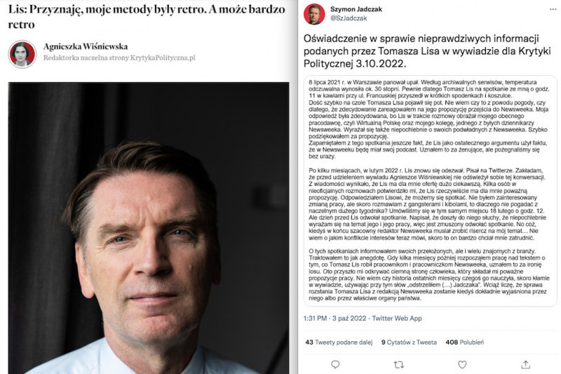Szymon Jadczak szybko odpowiedział Lisowi. Na Twitterze opublikował "Oświadczenie w sprawie nieprawdziwych informacji podanych przez Tomasza Lisa w wywiadzie dla Krytyki Politycznej 3.10.2022". Opisał dwie propozycje przejścia z WP do "Newsweeka", które Lis składał mu w lipcu 2021 i lutym 2022 roku.