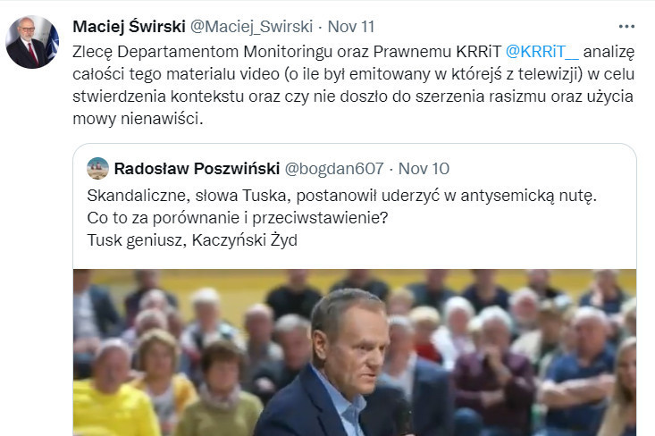 Maciej Świrski zapewnił jego i innych swoich followersów: "Zlecę Departamentom Monitoringu oraz Prawnemu KRRiT analizę całości tego materialu video (o ile był emitowany w którejś z telewizji) w celu stwierdzenia kontekstu oraz czy nie doszło do szerzenia rasizmu oraz użycia mowy nienawiści". Zapowiedział interwencję, mimo że z dołączonego do tweetu nagrania wynika, iż przytoczone przez Poszwińskiego słowa Donalda Tuska zostały wyjęte z kontekstu.
