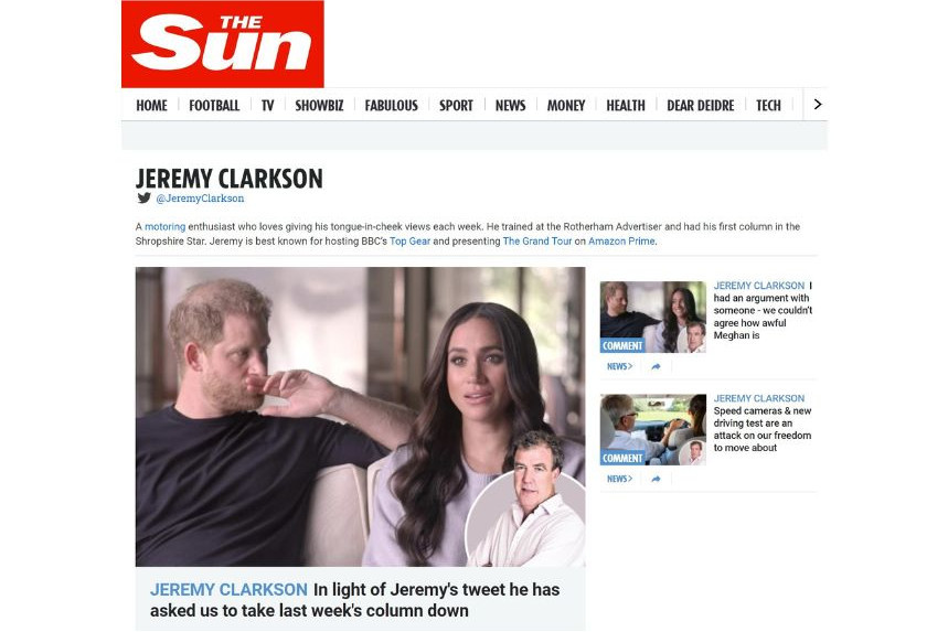 Półtora tygodnia temu Jeremy Clarkson – obecnie prowadzący w ITV teleturniej "Milionerzy", który sławę zdobył prowadząc przez wiele lat show motoryzacyjny "Top Gear" w BBC – napisał na łamach "The Sun" artykuł atakujący Meghan. Independent Press Standards Organisation (IPSO) otrzymał w związku z tekstem ponad 20 tys. skarg. Za pojedynczy artykuł najwięcej odkąd instytucja istnieje, tzn. od 2014.