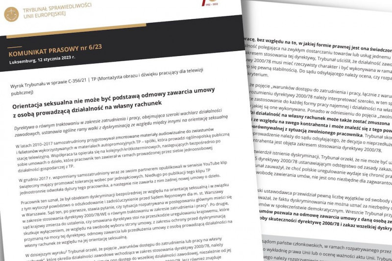 Trybunał Sprawiedliwości Unii Europejskiej w Luksemburgu uznał, że orientacja seksualna nie może być powodem odmowy zawarcia umowy z osobą prowadzącą działalność na własny rachunek. Sprawa dotyczy montażysty z TVP, który rozstał się ze stacją po publikacji klipu promującego tolerancję dla par jednopłciowych.