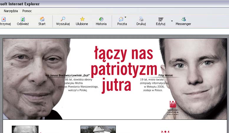 Bohaterowie pierwszego to 19-letni mistrz olimpiady informatycznej Filip Wolski z Gdańska oraz bohater powstania warszawskiego major Janusz Brochwicz-Lewiński "Gryf". Na drugim przedstawione są 16-letnia opiekunka kapliczek na warszawskiej Pradze Magdalena Giza oraz torturowana przez UB Kazimiera Kamińska. - To symboliczny sojusz starszego i młodszego pokolenia, sojusz bohaterów niepodległej Polski oraz najbardziej kreatywnej części młodego pokolenia - tłumaczy Ujazdowski. Minister twierdzi, że Polska potrzebuje nowego typu edukacji patriotycznej. Żeby była skuteczna, wymaga nowoczesnej promocji, która zaciekawi najmłodsze pokolenie. - Mówimy wielkie "nie" dla przekonania, że patriotyzm to nudne przedstawianie historii przodków - mówi " Rz" minister. Ale Ministerstwu Kultury nie chodzi tylko o promocję. Według urzędników billboardy promujące patriotyzm miałyby dawać do myślenia młodym Polakom, którzy planują emigrację zarobkową. - Program ma być zachętą dla tych, którzy chcą być aktywni, a ich energia i autentyzm może być potem wzorem i przykładem dla rówieśników - przekonuje Ujazdowski. Akcja kosztowała 150 tysięcy złotych i na razie potrwa miesiąc. Ministerstwo liczy na to, że dzięki pieniądzom polskich przedsiębiorców uda się ją przedłużyć. Zobacz(oprac. BW, 04.01.2007)