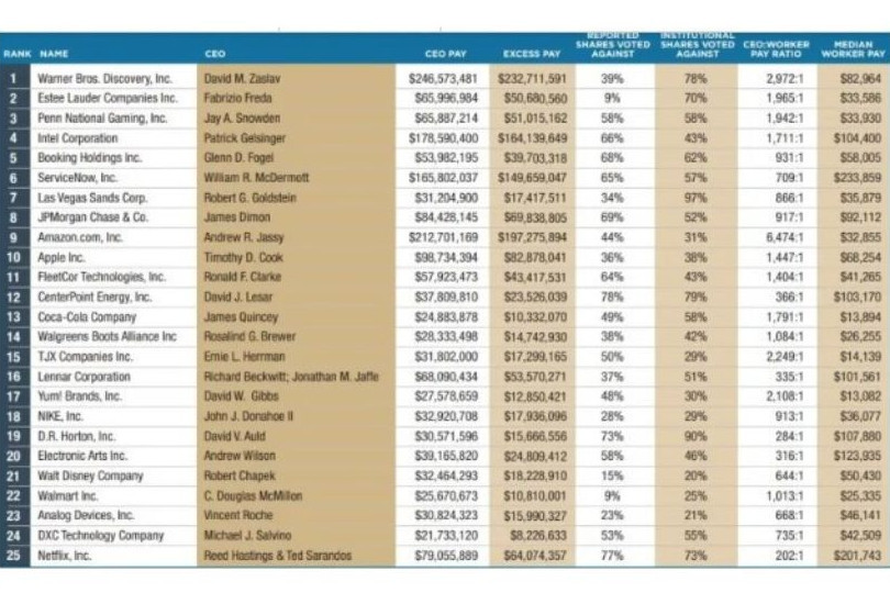Amazon, Apple, Disney i Netflix są również wysoko w dziewiątym raporcie grupy, który wykracza poza podstawowe wynagrodzenia. Organizacja non profit As You Sow, zajmująca się rzecznictwem akcjonariuszy, mierzy wynagrodzenie na podstawie trzech wskaźników: całkowitego zwrotu dla akcjonariuszy; liczby akcji, nad którymi głosowano przeciwko pakietowi wynagrodzeń dyrektorów generalnych na dorocznym zgromadzeniu oraz stosunku wynagrodzenia dyrektora generalnego do mediany wynagrodzenia pracownika (luka, która stale rośnie). Waży pierwsze dwa punkty danych po 40 proc. każdy, a wskaźnik płac za 20 proc.