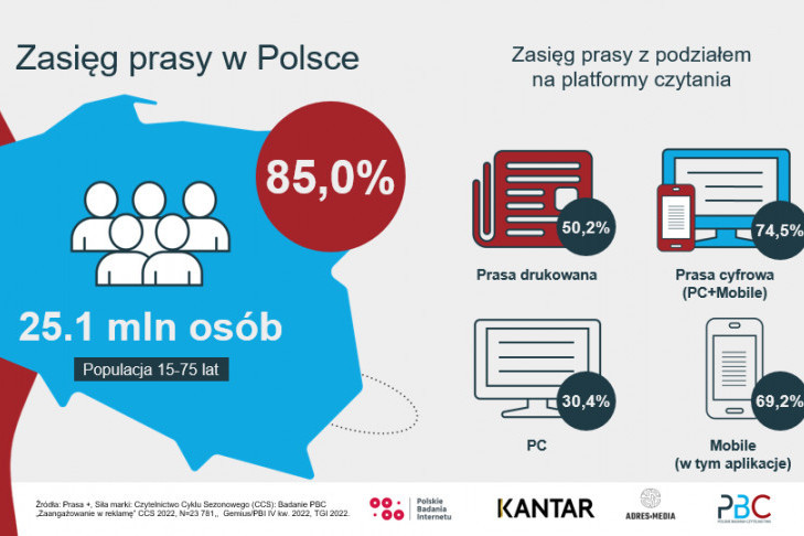 Przypomnijmy, że Kantar Polska oraz Polskie Badania Czytelnictwa regularnie prezentują na stronie pbc.pl wyniki badań (na reprezentatywnej próbie 23 tysięcy osób rocznie), które – podobnie jak na całym świecie - pokazują prasę jako medium wielokanałowe. Z badań wynika, że zasięg prasy w ostatniej dekadzie nie zmienił się, za to zmieniają się platformy czytania prasy.