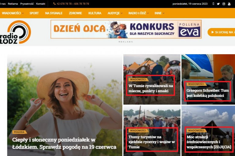 18 czerwca były to artykuły pt. "Europejski Zjazd Rycerstwa w Tumie pod Łęczycą", "Średniowieczny obóz historyczny w Tumie" i "Inscenizacja powstania styczniowego w Czastarach". W ostatnim z tych artykułów podano, że "inscenizację w Czastarach oglądał szef prezydenckiego biura polityki międzynarodowej Marcin Przydacz", a w pierwszym cytowano Grzegorza Schreibera, marszałka województwa łódzkiego. Na głównej stronie stacji znajdowała się też reklama Europejskiego Zjazdu Rycerskiego.