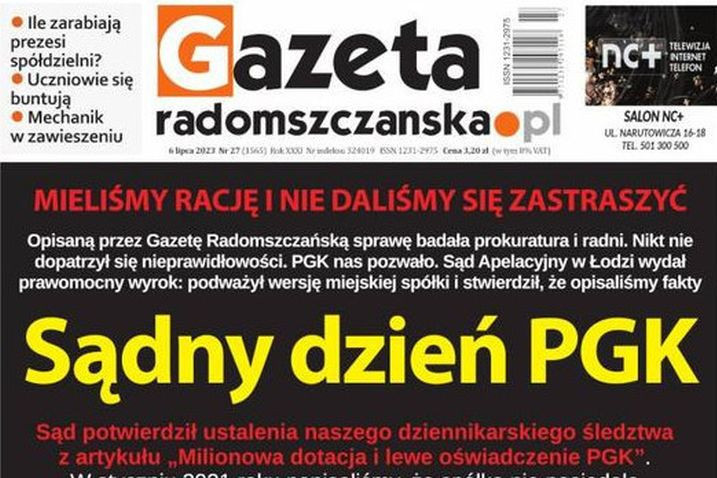 Prawomocnym wyrokiem na korzyść "Gazety Radomszczańskiej" zakończył się proces wytoczony redakcji przez samorządowe Przedsiębiorstwo Gospodarki Komunalnej w Radomsku. Gazeta ujawniła prawdę o wniosku dotyczącym wielomilionowej dotacji, który spółka złożyła, nie mając potrzebnych dokumentów.