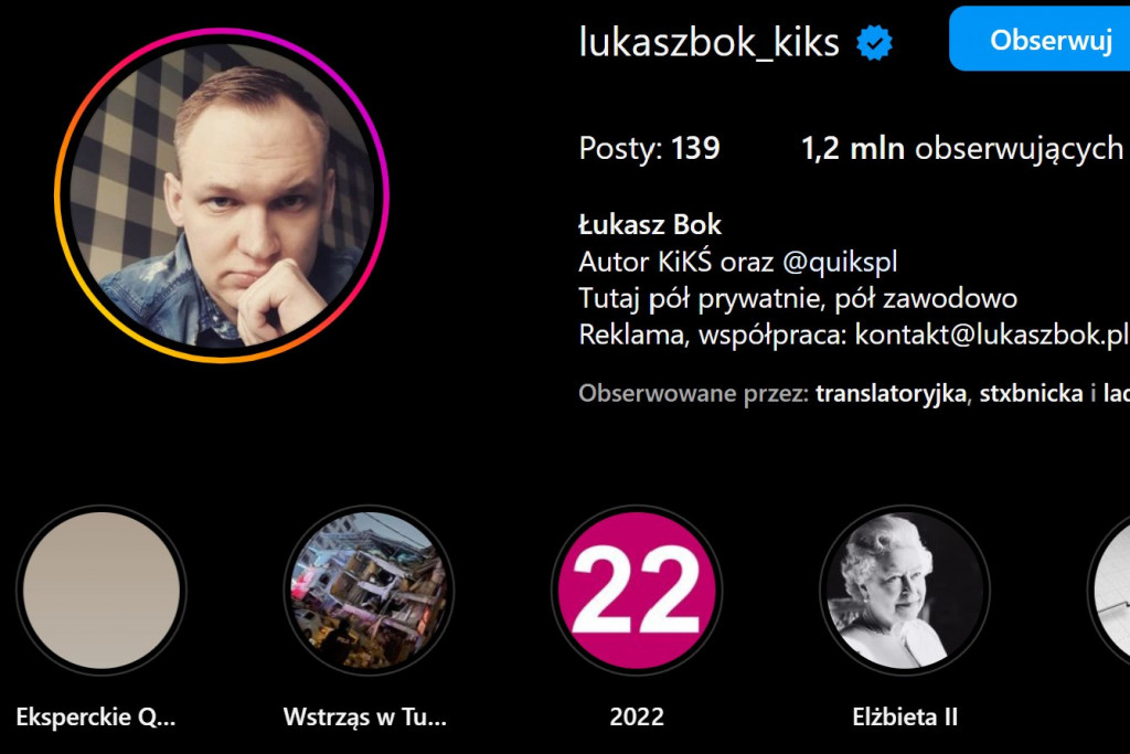 Łukasza Boka na Instagramie obserwuje aż 1,2 mln osób, to niewiele mniej niż Kubę Wojewódzkiego i o wiele więcej niż Filipa Chajzera (screen: Instagram/lukaszbok_kiks)