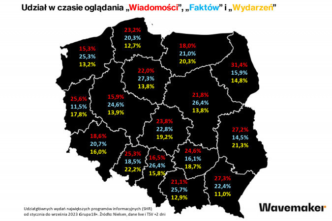 - Z kolei udział "Wydarzeń" waha się od 11 proc. (woj. podkarpackie) do 22,2 proc. (opolskie).