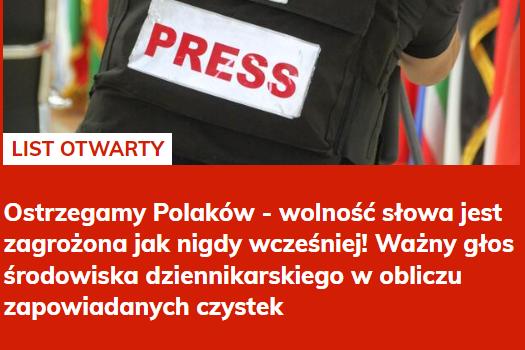 "W czasie ostatnich dni ze strony przedstawicieli ugrupowań politycznych skupionych wokół Donalda Tuska oraz ich zaplecza medialnego padły bardzo niepokojące stwierdzenia" – ostrzegają propagandyści w liście otwartym. I grzmią dalej: "Ostrzegamy Polaków – wolność słowa jest zagrożona jak nigdy wcześniej! Ważny głos środowiska dziennikarskiego w obliczu zapowiadanych czystek".