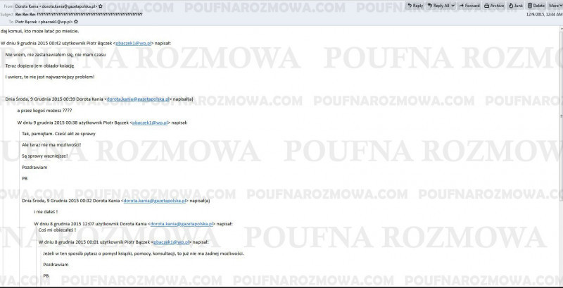 "Jeżeli w ten sposób pytasz mnie o pomysł książki, pomocy, konsultacji, to już nie ma żadnej możliwości" – pisze do Doroty Kani, wówczas zatrudnionej w "Gazecie Polskiej" i TV Republika Piotr Bączek, szef Agencji Wywiadu Wojskowego.