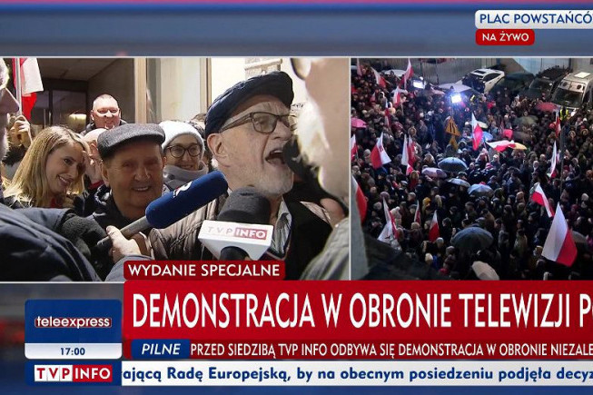 Kilkaset osób zgromadziło się na demonstracji, która w założeniu miała bronić obecnego statusu mediów publicznych. O zaplanowanej na czwartek demonstracji przed siedzibą TVP Info i programów informacyjnych przy placu Powstańców Warszawy dziennikarze informowali się już w środę wieczorem. Również wieczorem, ok. 20.30 o demonstracji na swoim profilu w serwisie X poinformował Samuel Pereira, szef TVP Info. Godzinę później zrobił to Miłosz Kłeczek z TVP. Potem zapowiedź demonstracji była emitowana na antenie TVP Info.