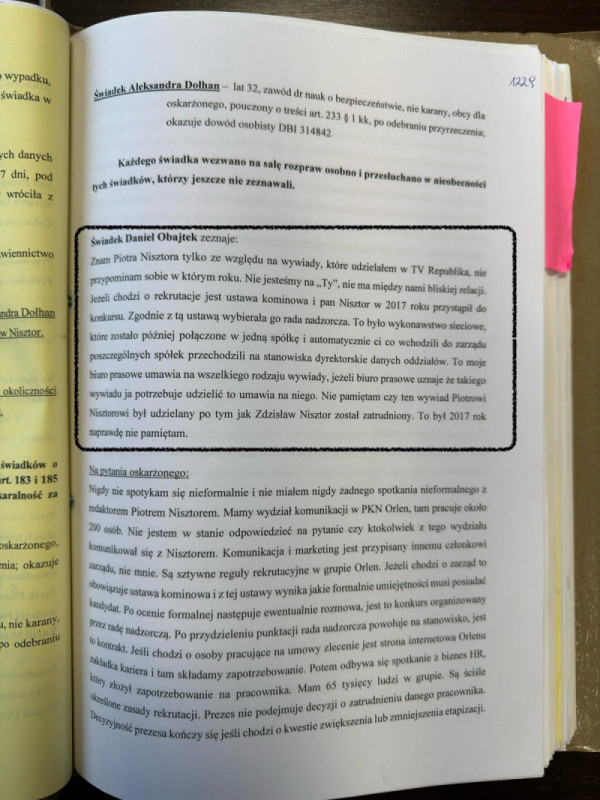 Jakubowski w prokuraturze ocenił: "Tymczasem w świetle upublicznionej przez portal Onet.pl w dniu 14 marca 2024 roku rozmowy Daniela Obajtka i Piotra Nisztora z czerwca 2018 należy stwierdzić, iż Piotr Nisztor składał fałszywe zeznania w zakresie twierdzeń opisanych w pkt 1-2 powyżej, gdyż rozmowa dotyczyła zatrudnienia w – kierowanej przez Prezesa Zarządu Daniela Obajtka – Grupie Orlen – żony oraz ojca Piotra Nisztora, tj. Aleksandry Dołhan oraz Zdzisława Nisztora" – dowodzi Jakubowski.