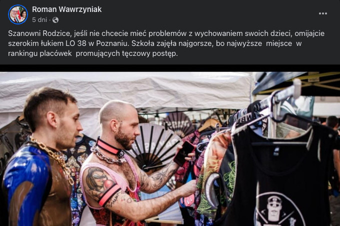 "Szanowni Rodzice, jeśli nie chcecie mieć problemów z wychowaniem swoich dzieci, omijajcie szerokim łukiem LO 38 w Poznaniu. Szkoła zajęła najgorsze, bo najwyższe miejsce w rankingu placówek promujących tęczowy postęp" – napisał na swoim profilu Roman Wawrzyniak, zwolniony niedawno z poznańskiego radia publicznego. Swój wpis opatrzył zdjęciem półnagich mężczyzn z łańcuchami na szyi.
