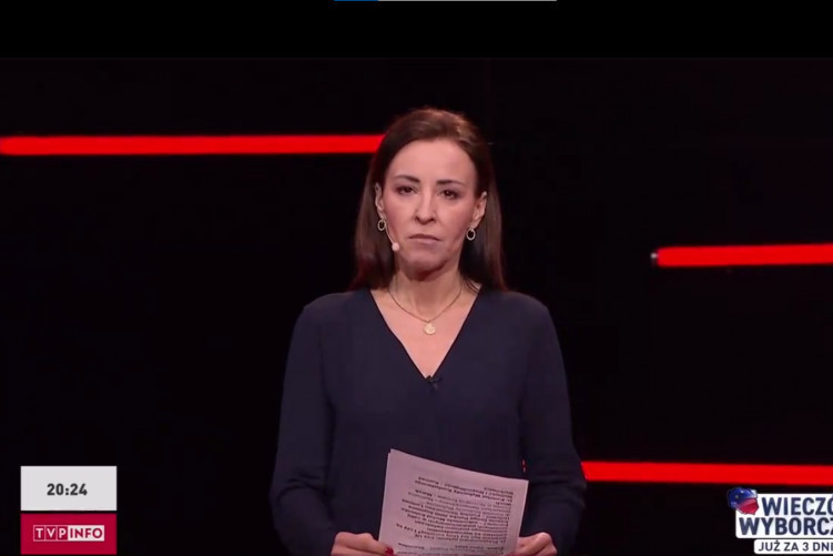 Dorota Wysocka-Schnepf, prowadząca w czwartek program "Niebezpieczne związki" w TVP Info, odczytała oświadczenie TVP, w którym telewizja tłumaczyła, dlaczego nie zgodziła się na udział w nim kandydata PiS do Parlamentu Europejskiego Jacka Kurskiego (screen: X.com/Pablo)