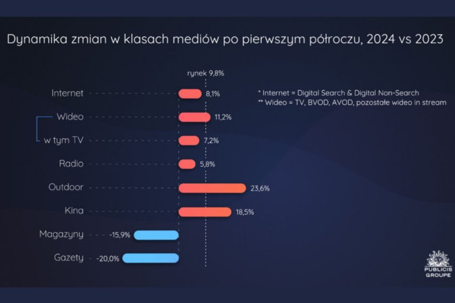 W pierwszym półroczu 2024 roku wzrosły inwestycje w reklamę zewnętrzną (o 23,6 proc.), kino (o 18,5 proc.), wideo (o 11,2 proc.), w tym telewizję (o 7,2 proc.), a także w internet (o 8,1 proc.) i radio (o 5,8 proc.).