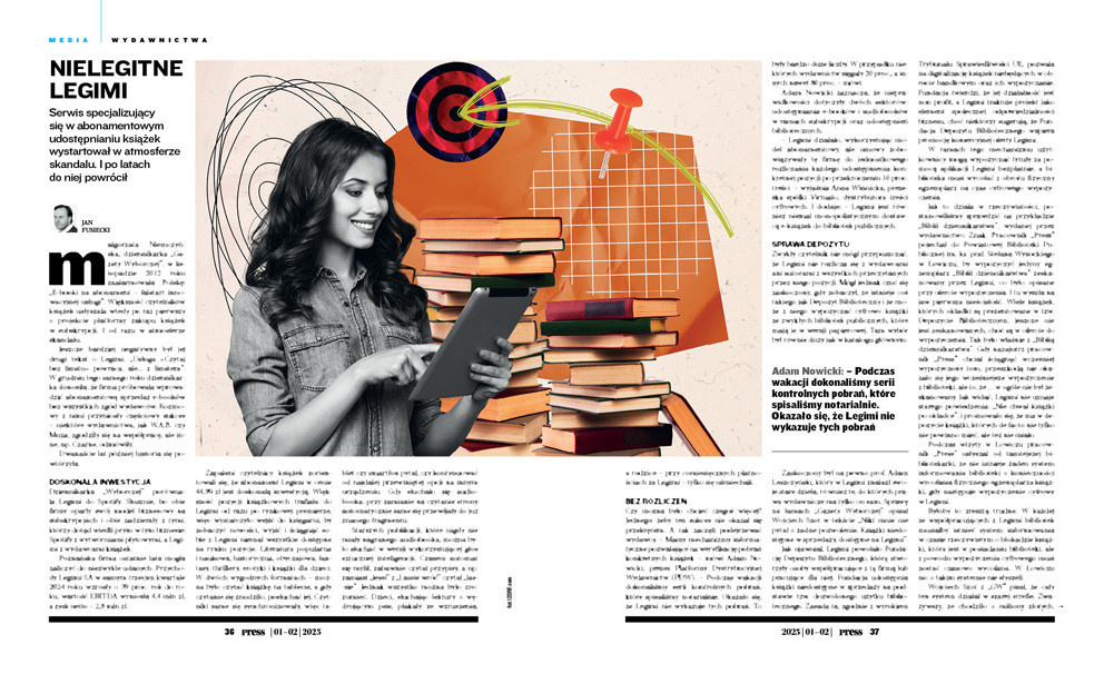 Czy można było chcieć czegoś więcej? Jednego: żeby ten sukces nie okazał się przekrętem. A tak zaczęli podejrzewać wydawcy. – Mamy mechanizmy informatyczne pozwalające na weryfikację pobrań konkretnych książek – mówi Adam Nowicki, prezes Platformy Dystrybucyjnej Wydawnictw (PDW). – Podczas wakacji dokonaliśmy serii kontrolnych pobrań, które spisaliśmy notarialnie. Okazało się, że Legimi nie wykazuje tych pobrań. To były bardzo duże liczby. W przypadku niektórych wydawnictw sięgały 20 proc., a innych nawet 80 proc. – mówi.