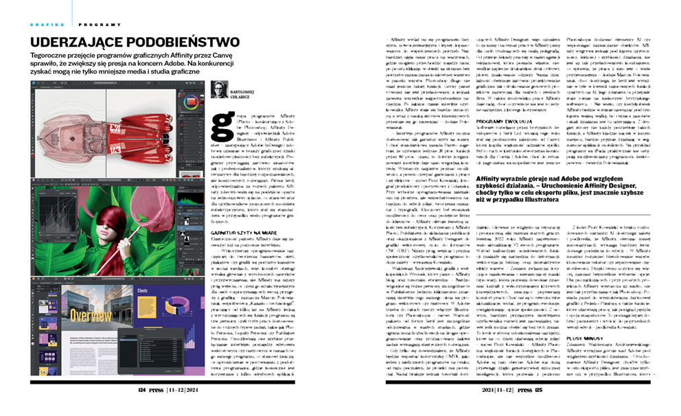 Waldemar Andrzejewski, grafik z wielkopolskich Wronek, który pisze o Affinity blog oraz tutoriale, stwierdza: – Bardzo wygodne są różne persony, szczególnie te w Publisherze. Jednym kliknięciem zmieniają interfejs tego samego okna na program wektorowy czy rastrowy. W Adobe trzeba do takich rzeczy włączyć Illustratora czy Photoshopa – mówi. Wartość pakietu od formy Serif jest szczególnie odczuwalna w małych studiach, gdzie ograniczona liczba licencji na drogie oprogramowanie oraz zróżnicowany zakres zadań wymagają elastycznych rozwiązań. – Gdy tylko się dowiedziałem, że Affinity będzie wspierać kolorystykę CMYK, jako jeden z nielicznych programów na rynku, od razu poczułem, że projekt ma potencjał. Nadal brakuje jednak tutoriali dotyczących Affinity Designer, więc uznałem to za niszę i na temat pracy w Affinity piszę dla osób trudniących się małą poligrafią. Od prawie dekady pracuję w małej agencji reklamowej, która posiada własne, niewielkie zaplecze drukarskie: druk cyfrowy, ploter, znakowanie odzieży. Nasza działalność obejmuje zarówno projektowanie graficzne, jak i drukowanie gotowych projektów zazwyczaj dla małych i średnich firm. W takim środowisku pracy Affinity daje radę, choć oczywiście nie jest to jedyne narzędzie, z którego korzystamy.