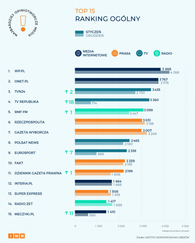 W styczniowym zestawieniu Top 15 najczęściej cytowanych mediów w Polsce największy udział – wynoszący 33 proc. – uzyskała prasa ("Rzeczpospolita", "Gazeta Wyborcza", "Fakt", "Dziennik Gazeta Prawna", "Super Express"). Na drugim miejscu znajdują się ex aequo media internetowe (Wirtualna Polska, Onet, Interia, Meczyki) i telewizja (TVN 24, Republika, Polsat News, Eurosport), do których należało po 27 proc. udziału. Na ostatnim miejscu znajdują się stacje radiowe z udziałem wynoszącym 13 proc. (RMF FM, Radio Zet).