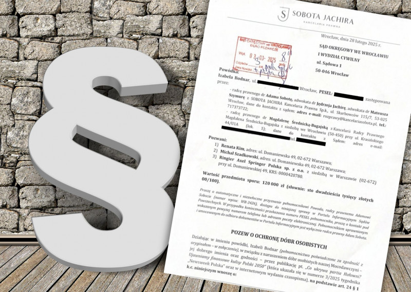 Pozew wpłynął wczoraj do Sądu Okręgowego we Wrocławiu. Dotyczy materiału Renaty Kim "Co ukrywa partia Hołowni? Ujawniamy finansowe kulisy Polski 2050", który ukazał się w trzecim tegorocznym numerze "Newsweek Polska" i w serwisie internetowym tygodnika. Kim opisała m.in. partyjną ścieżkę obecnej posłanki i związane z tym aktywności finansowe Bodnar i jej rodziny.